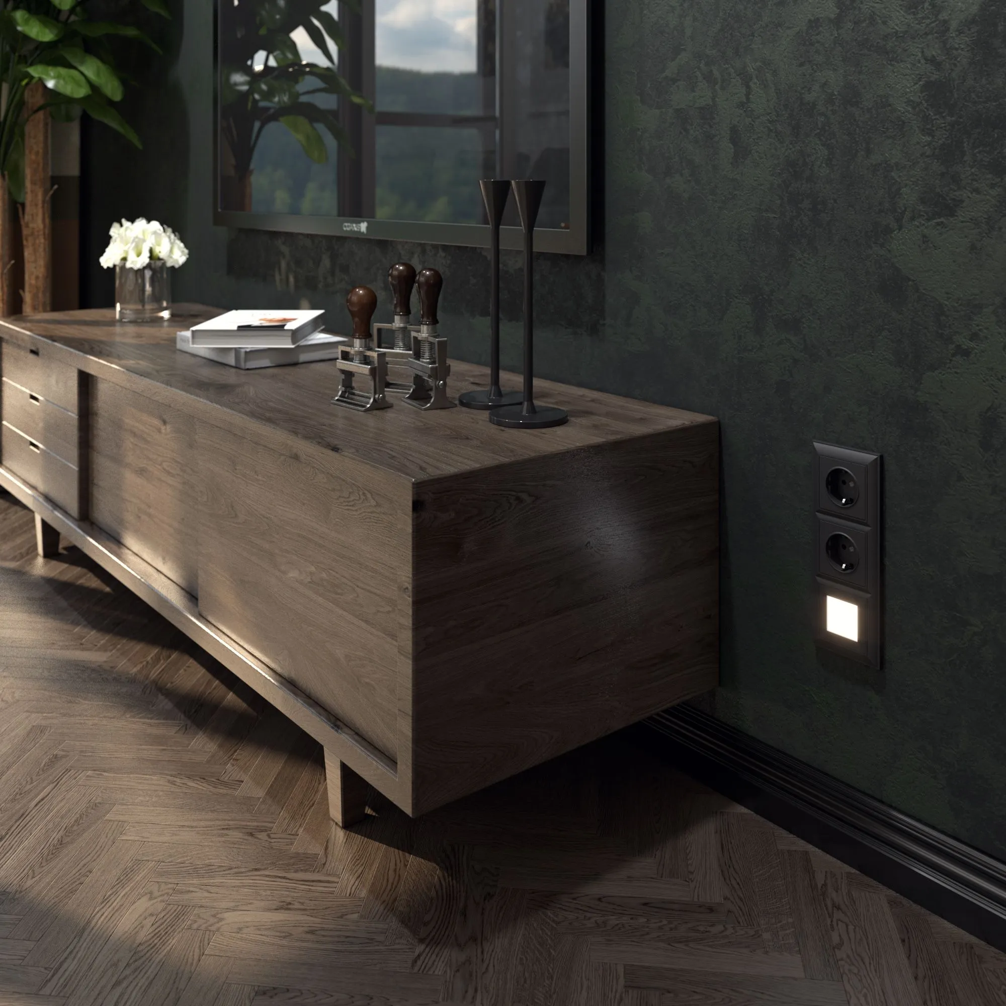 Лицевая панель выполнена в матовом черном цвете с бархатистой фактурой и тактильной мягкостью. Такая поверхность не бликует, не притягивает пыль и идеально вписывается в любые стили — от скандинавского минимализма до лофта и классики. Черный цвет гармонично сочетается с любыми отделочными материалами, а универсальная совместимость со всеми рамками Werkel позволяет создавать индивидуальные композиции под ваш вкус.